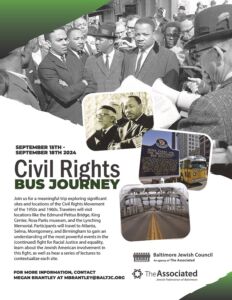 Join us for a meaningful trip, September 15-18, 2024, exploring significant sites and locations of the Civil Rights Movement of the 1950s and 1960s. Travelers will visit locations like the Edmund Pettus Bridge, King Center, Rosa Parks Museum, and the Lynching Memorial. Participants will travel to Atlanta, Selma, Montgomery, and Birmingham to gain an understanding of the most powerful events in the (continued) fight for Racial Justice and equality, learn about the Jewish American involvement in this fight, as well as hear a series of lectures to contextualize each site.Learn all about the trip HERE